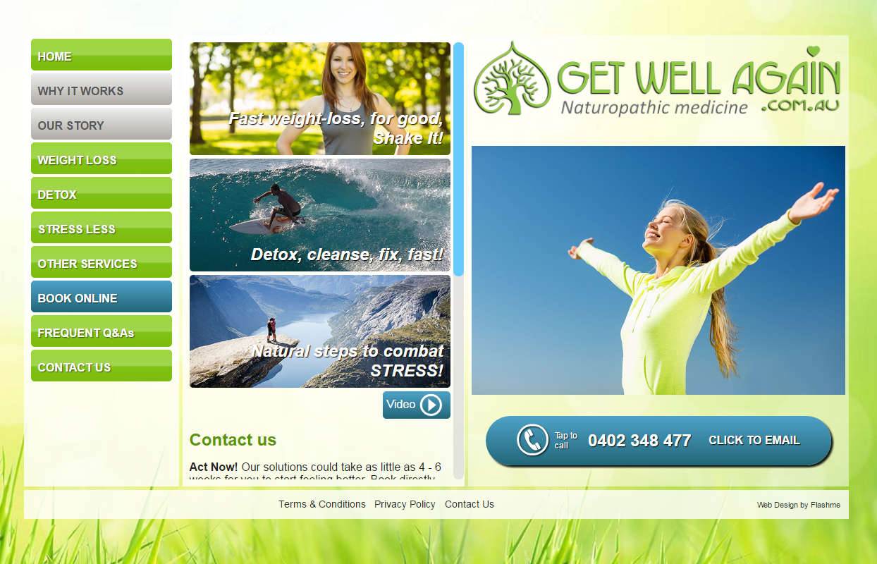 Get Well Again features streaming video with image slideshows. When the video ends, the images continue. Never wasting space or the opportunity to present more sales data to your visitors. Embedded booking engine and more.